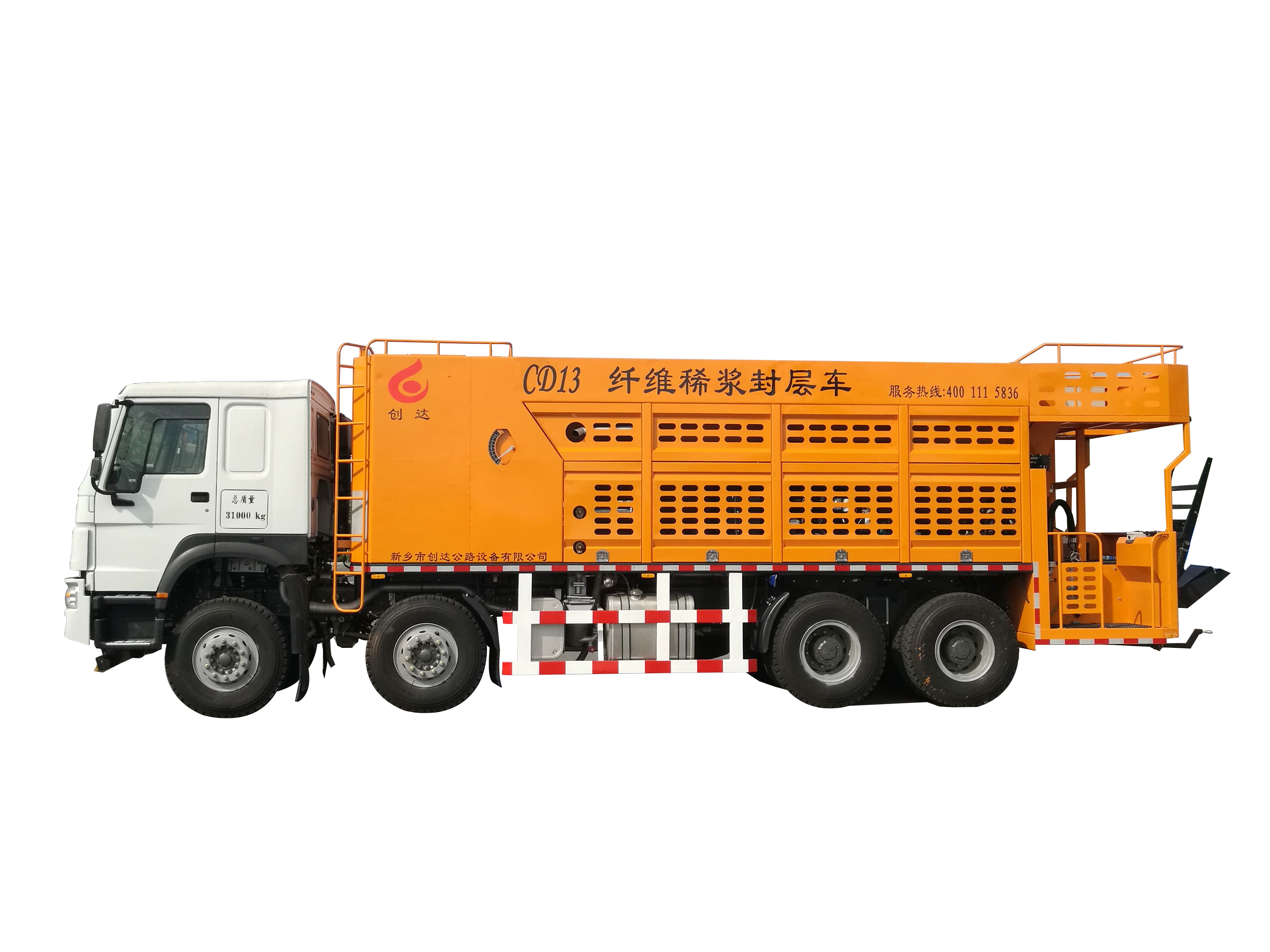 我公司设计生产的CDXF13AX型纤维稀浆封层车采用机、电、液、气一体化操作控制,具有物料按比例掺配精准、纤维切割分散均匀一致、混合料拌和强劲、浆料布料均匀无离析、摊铺平整一致、低速控制稳定等优点,是目前纤维稀浆封层与微表处施工的理想机械。